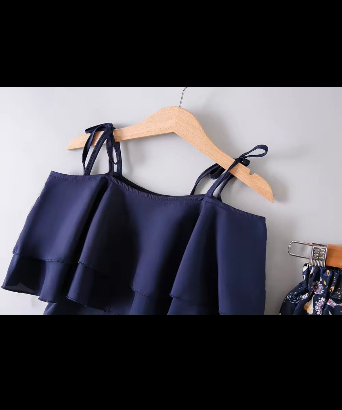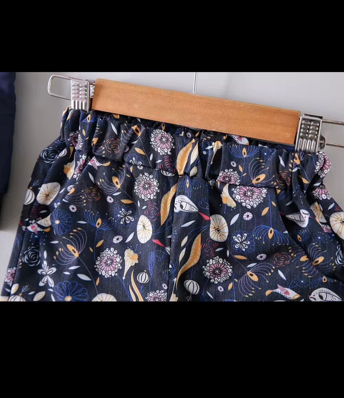 この夏、女の子がさわやかに楽しむためのアイテムが揃ったセットアップです。涼やかなネイビーのシフォンキャミと可愛らしい花柄パンツがセットになっています。キュートなフラワーモチーフが散りばめられたパンツは、太もも部分がゆったりとしたルーズフィットで動きやすさも抜群。デイリーやお出かけにもぴったりなアイテムです。