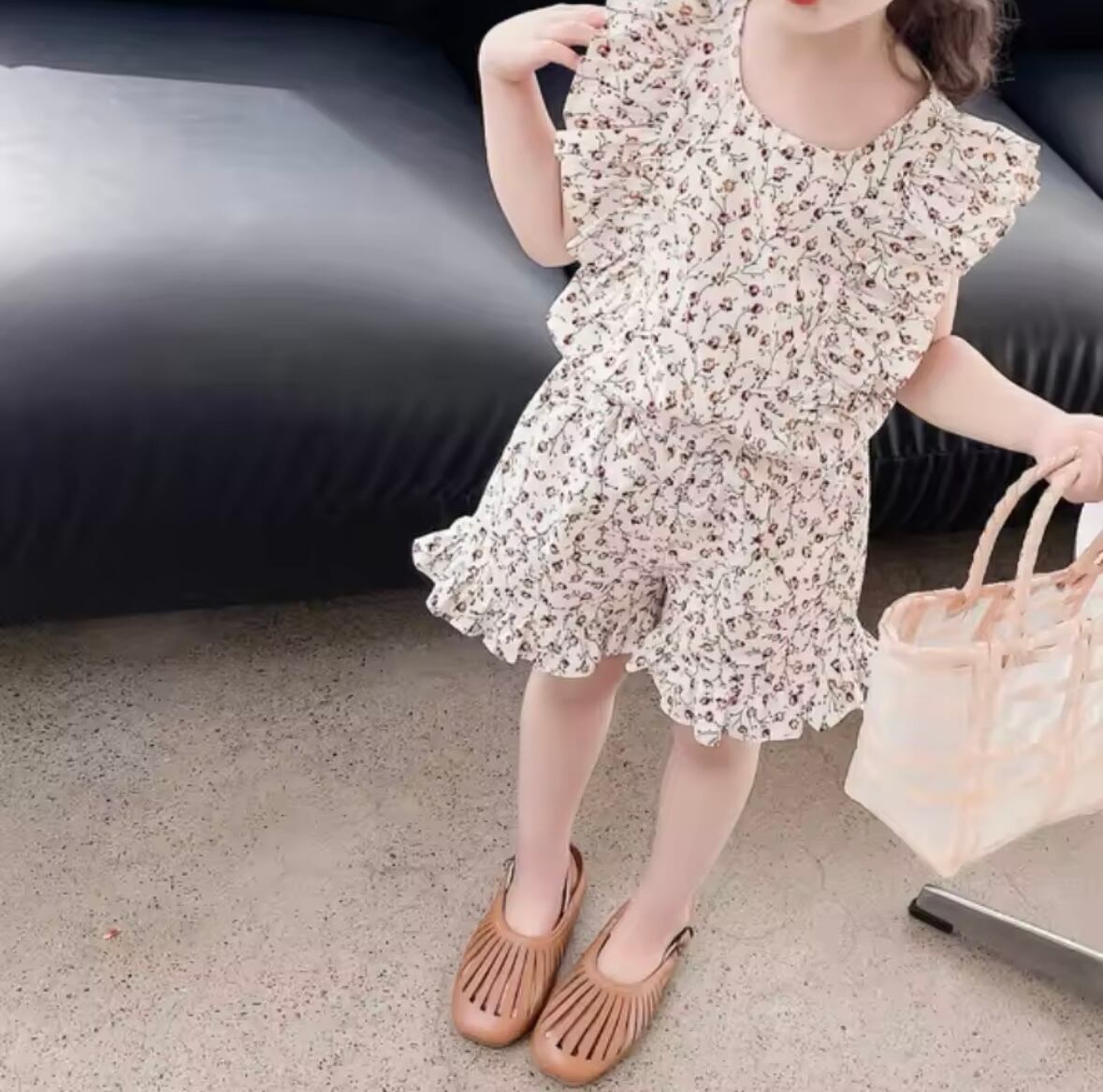 この綿の花柄のトップとショーツのセットは、可愛らしさ満点の女の子のための夏服です。新しい2024年のコレクションから生まれたこのセットアップは、サイズ90〜130まで揃っています。