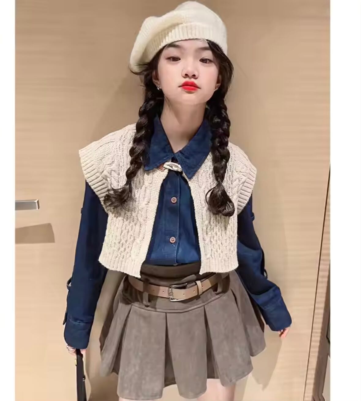 おしゃれでかわいいデニムシャツとニットカフス、プリーツスカートの3ピースセットが登場です!秋のシーズンにぴったりなこのアイテムは、10代の女の子におすすめのスタイリッシュなスタイルです。
